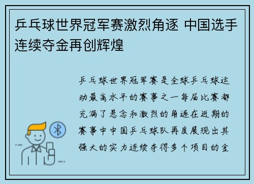乒乓球亚洲锦标赛激战正酣 中国队包揽男子单打冠亚军再创辉煌